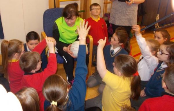 Combined Ireland Team player, Sinead McLaughlin, tells the children about her sport (Ladies Gaelic Football) and shows them some of the tools of the trade.