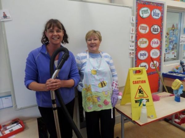 Pauline and Angela, our school cleaners, called into P1 this week and told the children all about their jobs. Their visit was connected with the P1 topic of "People Who Help Us”. Alan, the school caretaker, dropped in as well but he was camera shy!