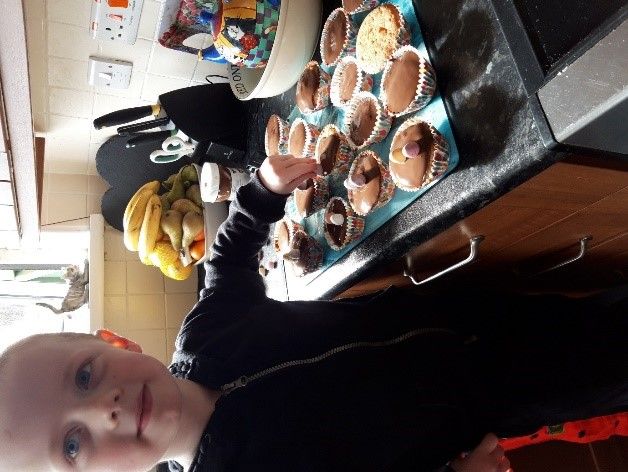 Lots of boys and girls have been using their time at home to bake lovely buns and cakes. Here we see Fianna (P1) using the mixer and Matthew (P1) with his finished buns. Well done to both of you!