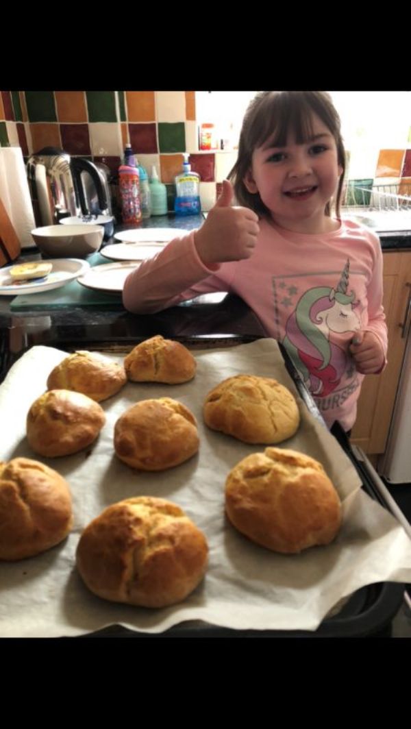 Lots of boys and girls have been using their time at home to bake lovely buns and cakes. Here we see Fianna (P1) using the mixer and Matthew (P1) with his finished buns. Well done to both of you!