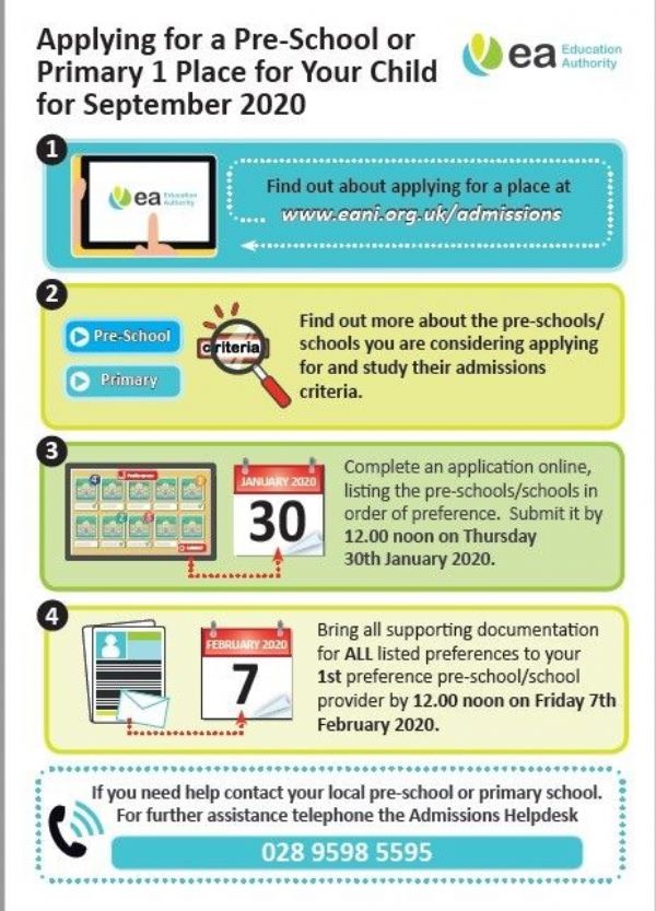The application process for the September 2020 Primary 1 intake is now open. Parents should log on to the Education Authority (EA) website (https://www.eani.org.uk/), click the admissions tab on the right and follow the instructions to register to complete an online application. Applications can only be made online. Additional detail can be found on the reverse of this note.