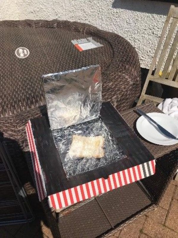 Jude (P4) has been taking advantage of the good weather to carry out an experiment. He created a way to use solar energy to cook his lunch. It looks like cheese on toast. Yummy!